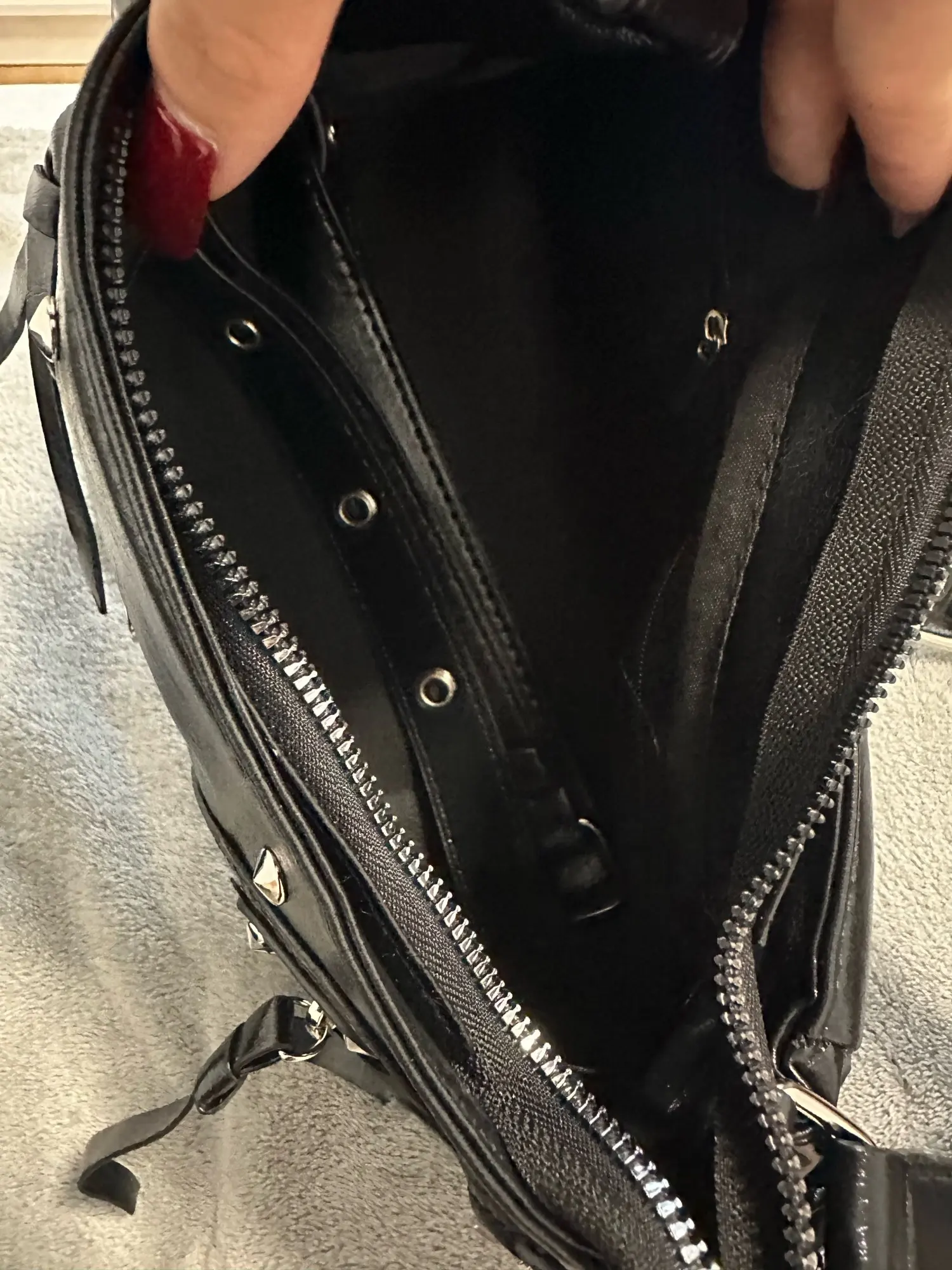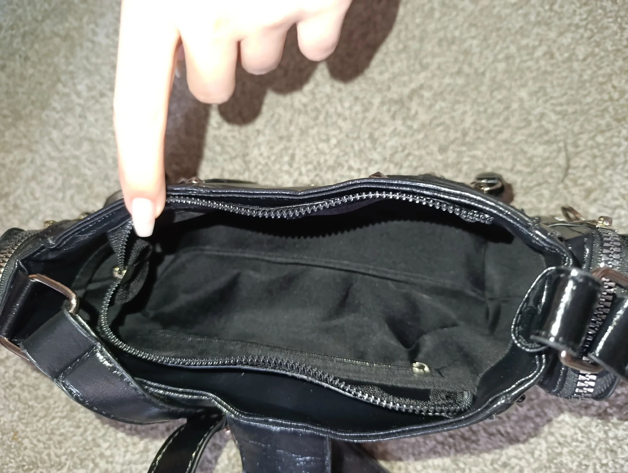 this is my new love. perfect size, amazing quality!! For clarity, I compared the size with an old handbag. There is 1 small pocket inside, the pockets open on the sides.